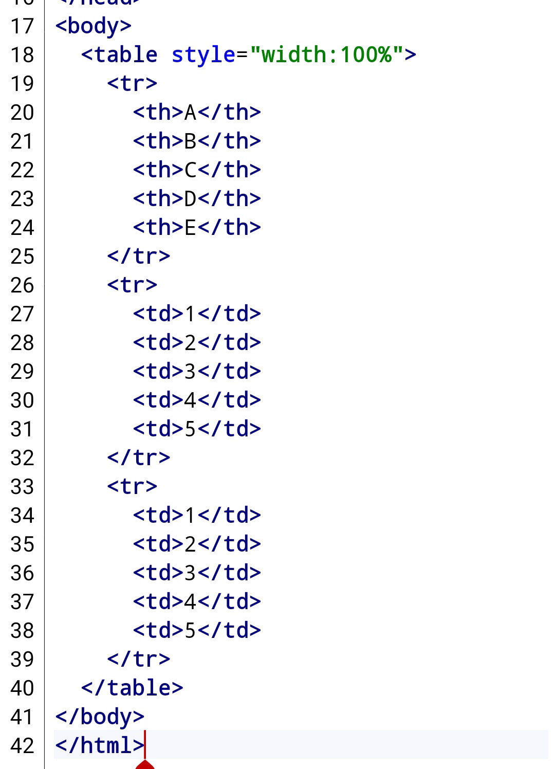 - Di baris 18 sampai baris 40 kita membuat tabel dengan jumlah kolom 5 dan jumlah baris 3, di kode baris 18 kita mengatur lebar tabel 100 persen dari lebar halaman web.